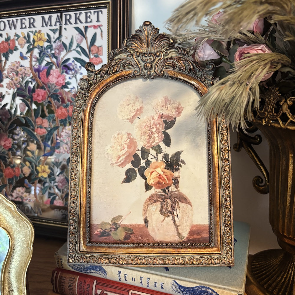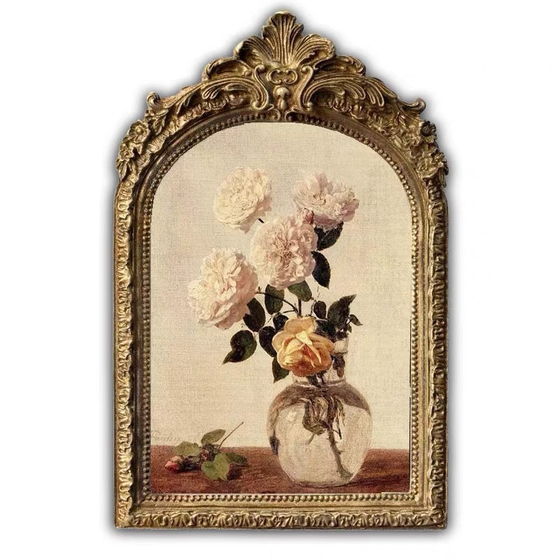 Bring floral charm into your décor with White & Yellow Roses. This delicate bouquet is reproduced on archival canvas and set in a vintage ornate gold frame, echoing our fleur-arch style. A lovely accent for kitchens, dining rooms, or gallery walls, this artwork adds warmth and refinement with its soft palette.