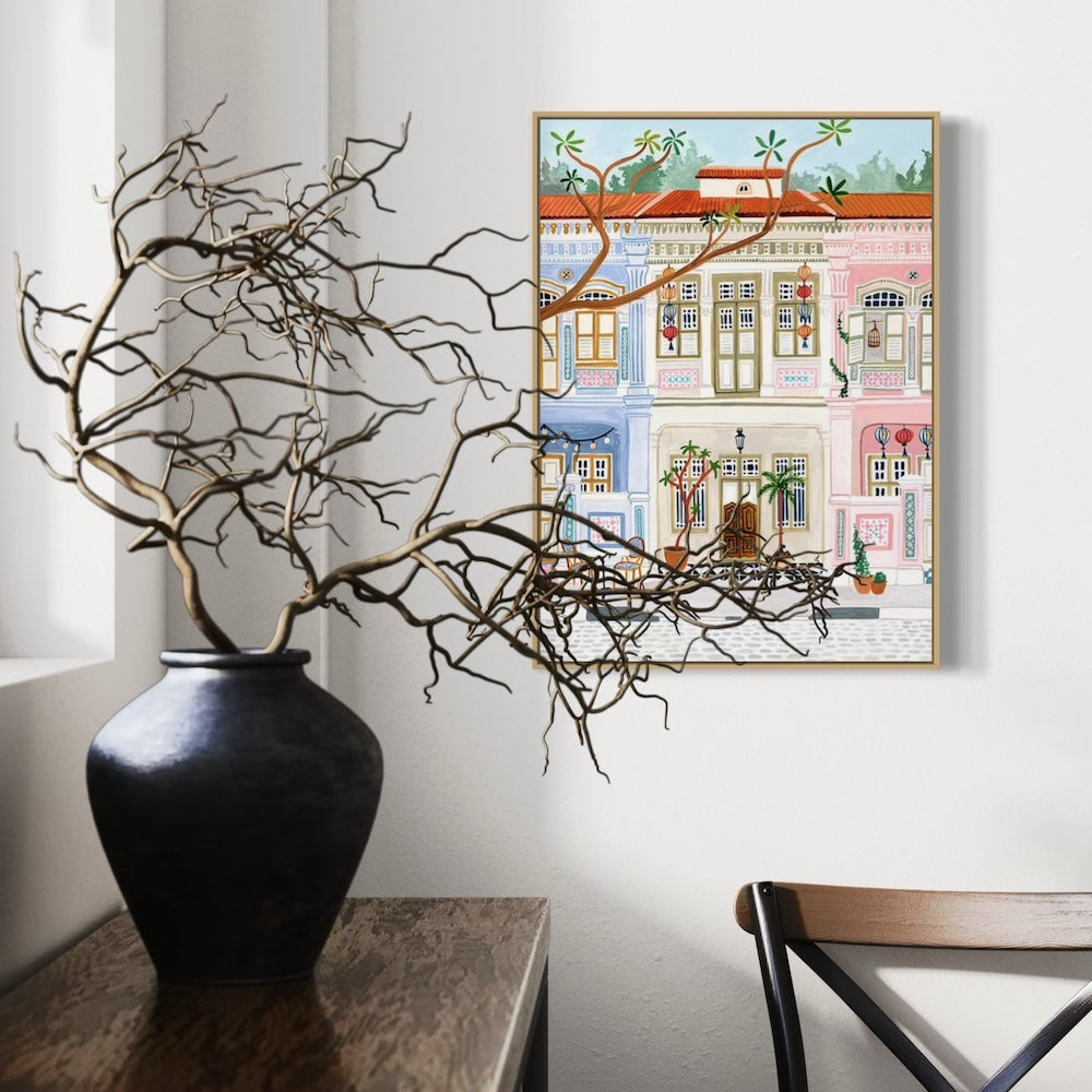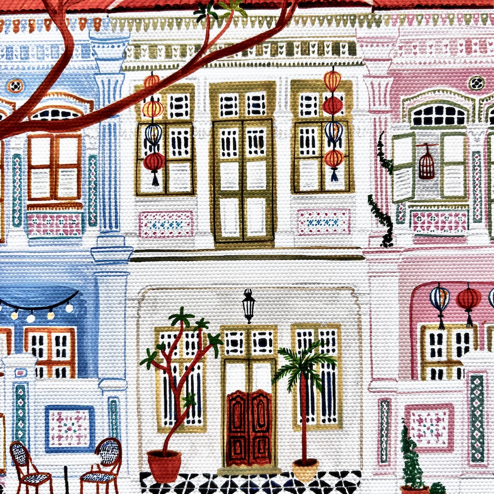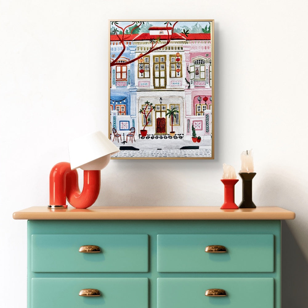 Perfect for travel lovers, architecture enthusiasts, or anyone drawn to vibrant cultural art, this print adds warmth and character to any space. Hang it in a living room, style it in a dining nook, or use it as a standout piece in a gallery wall to celebrate the beauty of Singapore’s shophouse heritage.